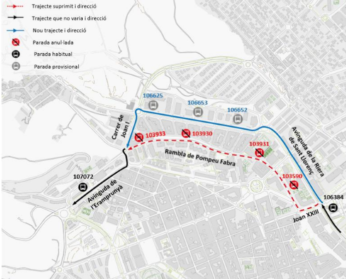 El dimecres 5 de novembre de 2025 a les 10:00 i fins a les 15:00 aproximadament, es modifica provisionalment el recorregut habitual a la Rambla de Pompeu Fabra de Gavà a causa de l'instal·lació de l’enllumenat Nadalenc amb l'anul·lació provisional de les parades afectades.