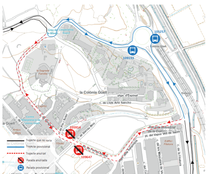 El dimecres 5 de novembre de 2025 a les 10:00 i fins a les 17:00 aproximadament, es modifica provisionalment el recorregut habitual a la Colònia Güell de Santa Coloma de Cervelló amb l'anul·lació provisional de les parades afectades.